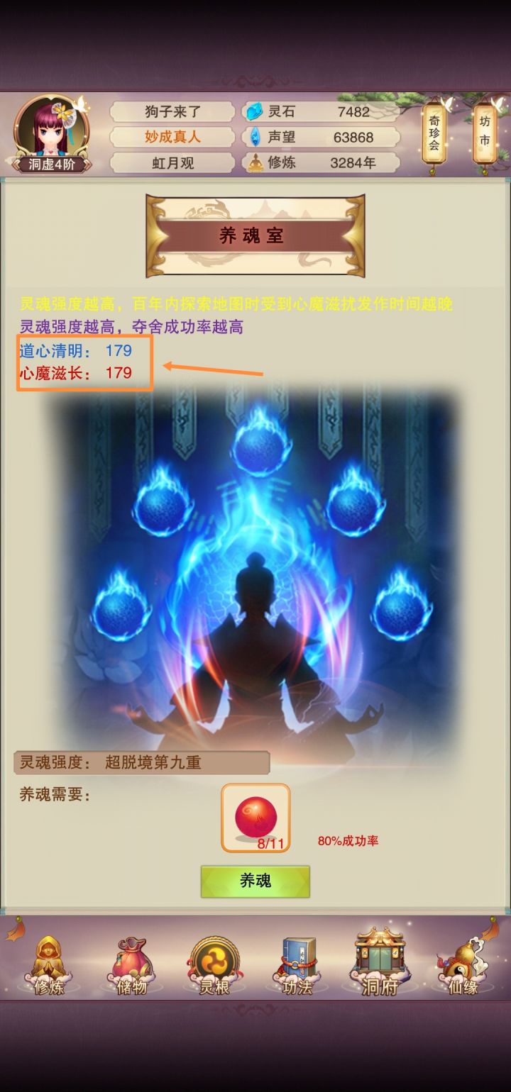 发现新区好多人问这个,想想还是把卡收益的原理和步骤仔细讲一遍,让大家有个概念,很多人云里雾里的也卡了,但不知道为什么。?(不知道卡收益算不算bug,会不会被封贴)言归正传,首先要知道卡收益是什么意思。 进图打怪,他会爆灵石和声望2种固定资源,有概率出装备、渡劫丹、药材、石头等一些浮动资源。看下图,道心清明意思就是声望和灵石必出,就是大家所说的满收益;而心魔滋长就是声望灵石有概率出(有可能都出有可