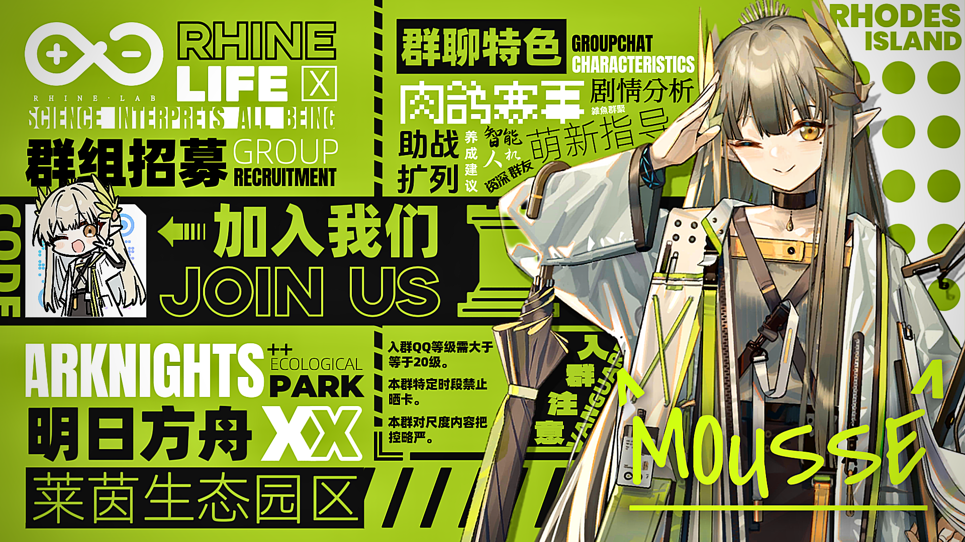 本群「莱茵生态园区」是群组「明日方舟♜」的三群,于2025年9月1日创立,目前已云集近650位来自五湖四海的博士,活跃度近70%,周活消息近10万条。是我们倾心打造的「优质明日方舟交流群」。群组每逢寒暑假期就会举办规模宏大的集成战略赛事「蜜饼杯」,冬季赛12人/夏季赛16人,进入决赛(前四)即可获得包括但不限于明日方舟手办、月卡、公仔、亚克力、挂件等精美奖品。比赛将全程在b站进行直播,喜欢集成战