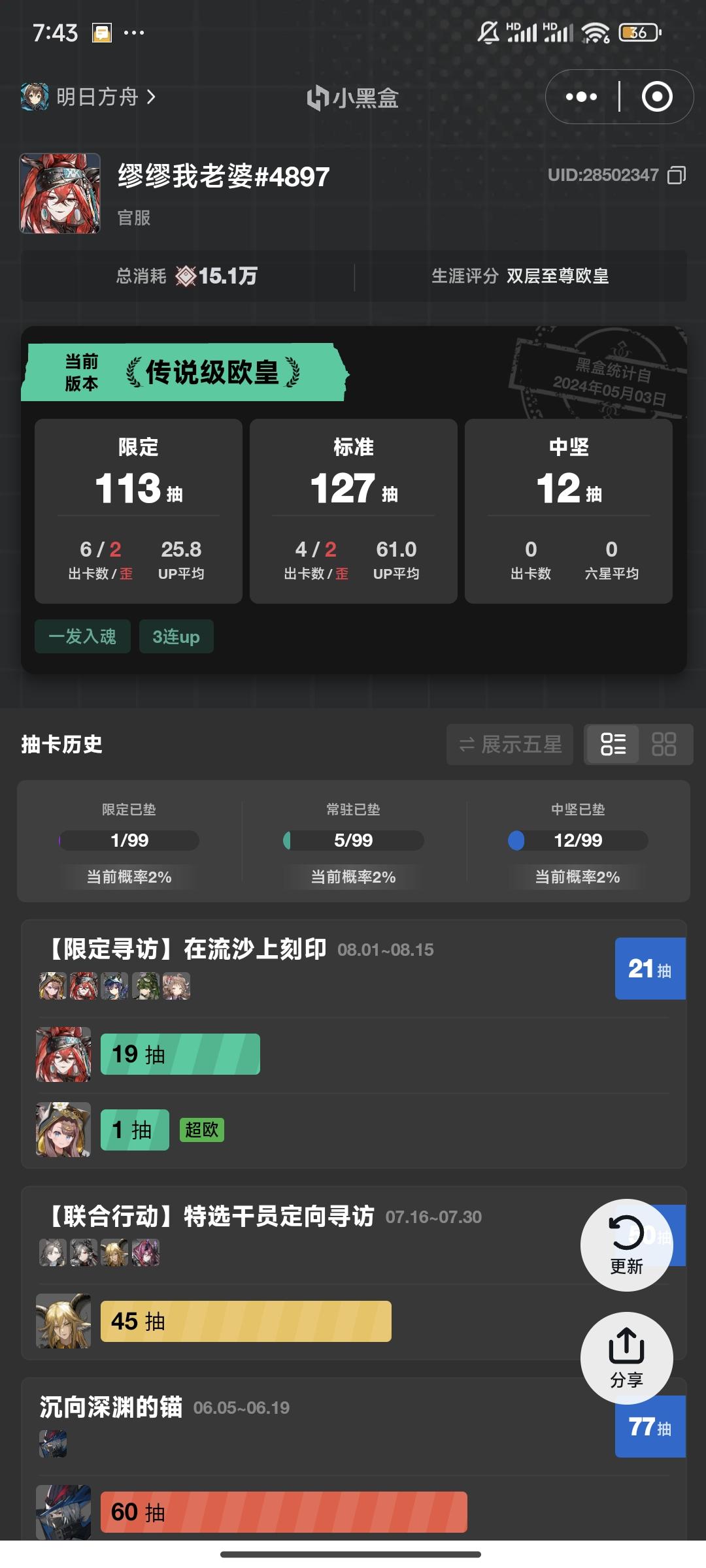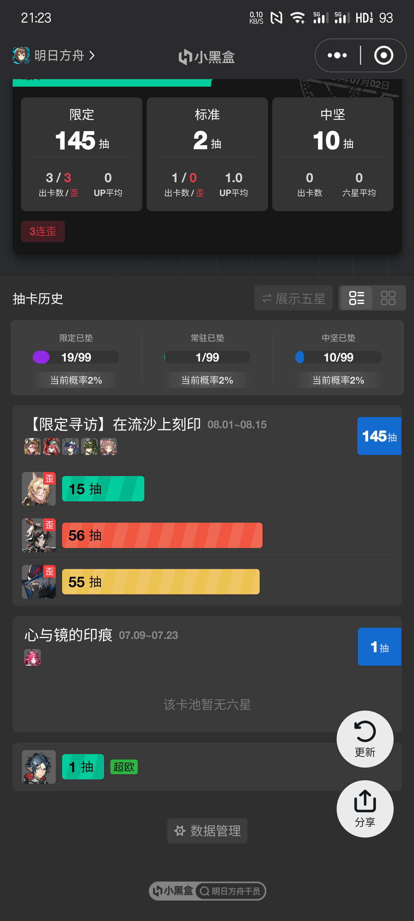 攒的一百四十多抽全下去,坏消息是全歪甚至一个up的都没有,直接三连歪,好消息是三个new,这下是真的哭笑不得。😂😂😂