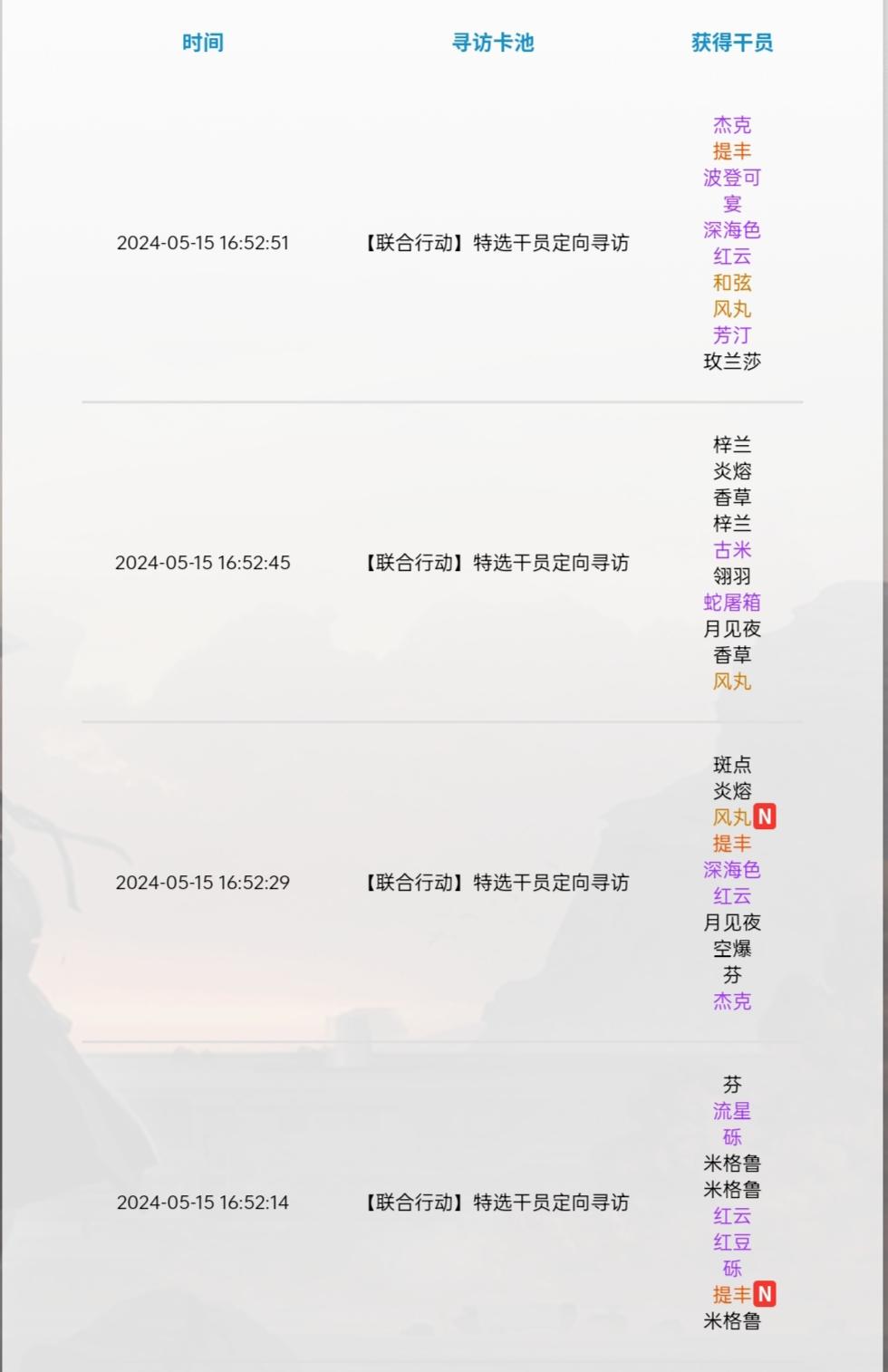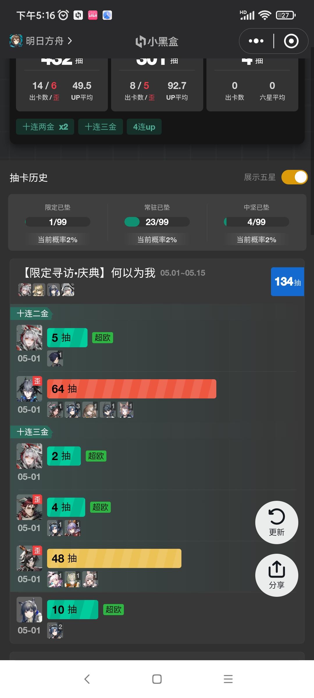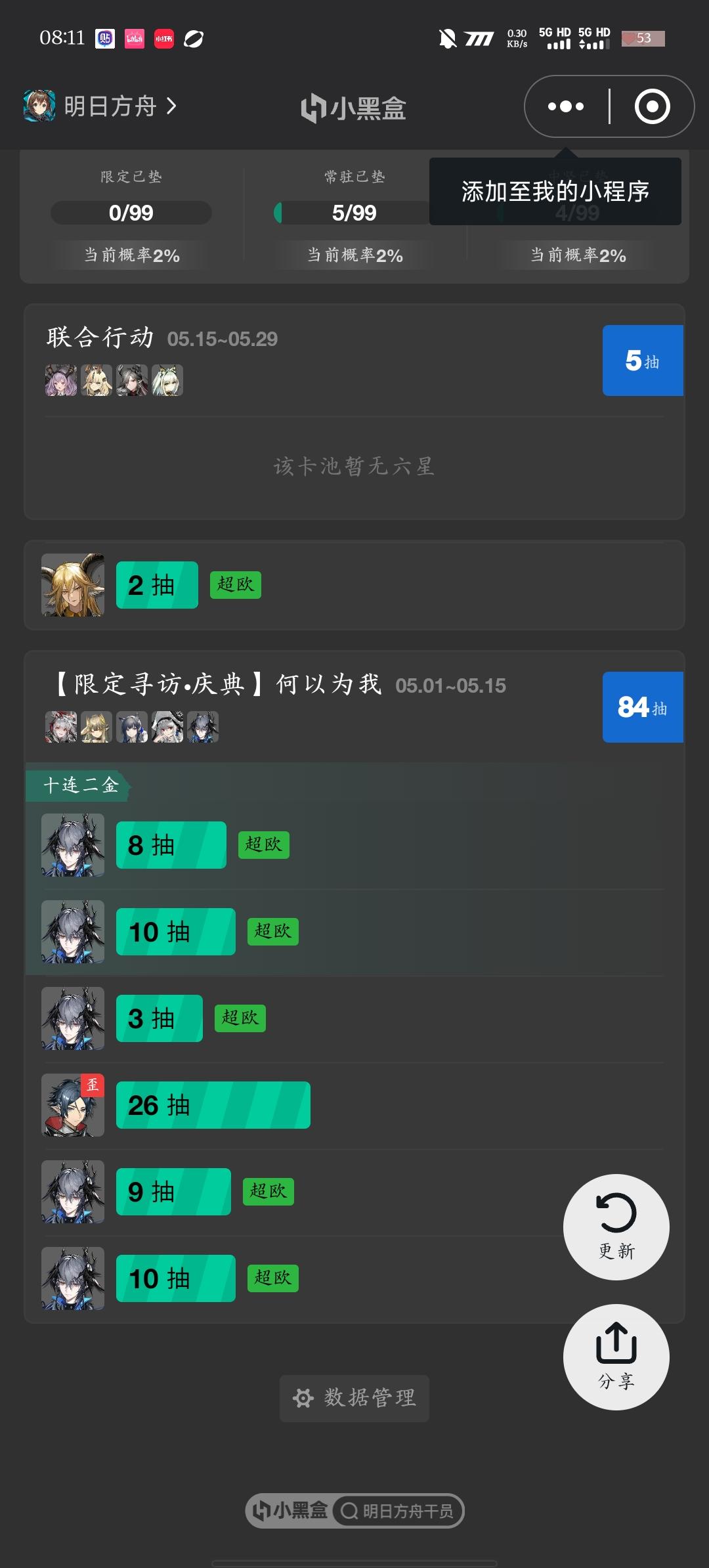 标准池已经累计了56抽,感觉应该很快就会出了 看了下明天的卡池感觉强度不算太高就先把六星保底用掉了~ 其实有点纠结是抽联合寻访还是这期的轮换来着 想了想还是抽了联合寻访,因为还没抽到过提丰来着…… 虽然最后出的是凯尔希就是了[表情_叹气] #明日方舟五周年 #明日方舟 #游戏安利 #游戏推荐 #明日方舟抽卡 #抽卡