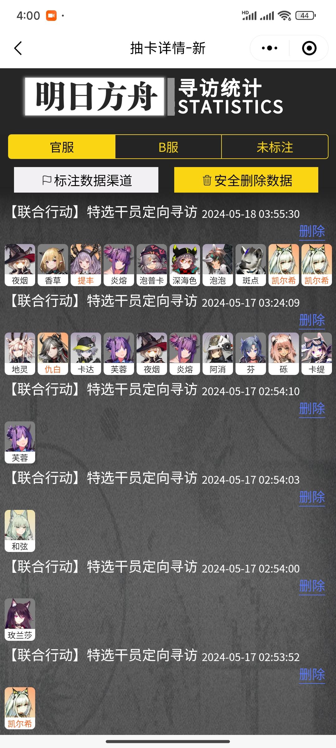 本人于2024年5月15日晚上9点50两发单抽出了一只凯尔希和一只焰影苇草望周知#明日方舟