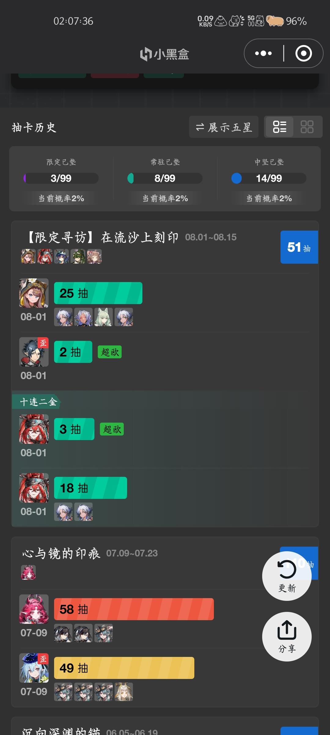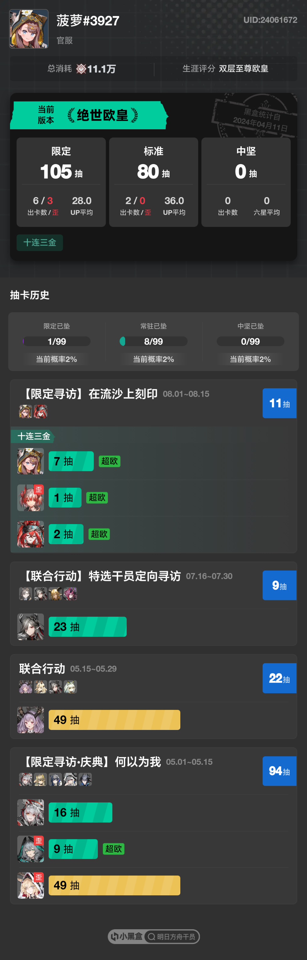 今天刷视频看别人单抽出六星,想试试,然后单点了57发出了个娜仁图雅给我抽红温了,一气之下把准备给半周年井异德的资源给羊井了,主线别传薅出来的石头死伤殆尽,迷宫饭和半周年抽卡计划胎死腹中,现后悔不已,大家抽卡虚谨慎,单抽试水就好,不要上头