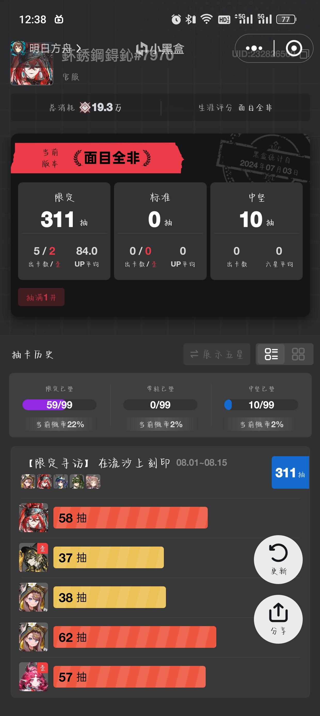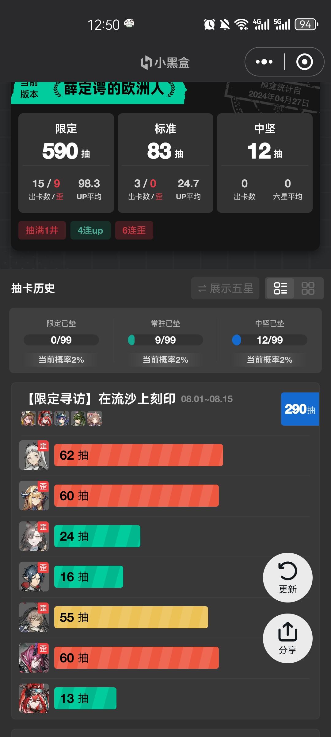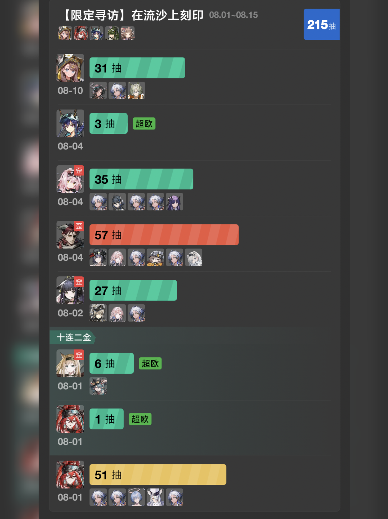 出金的概率是不低,但记得我抽的是佩佩和娜仁图雅的池子,出这两个算是怎么个回事?😱卡池即将结束,没希望了。
