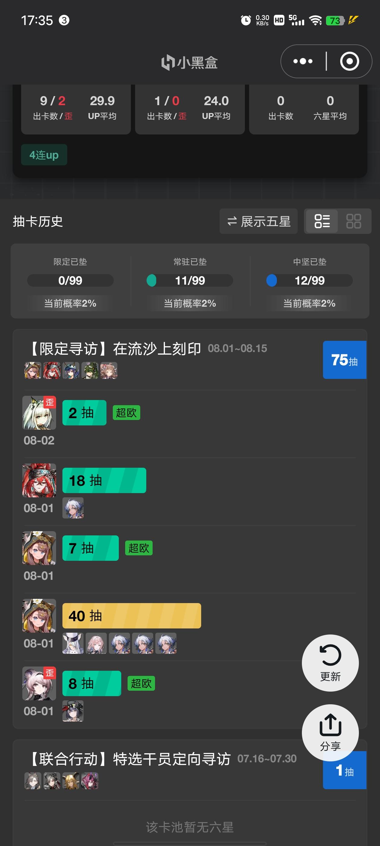 还算可以!75抽5个!今天免费一抽出了凯尔希。继续攒