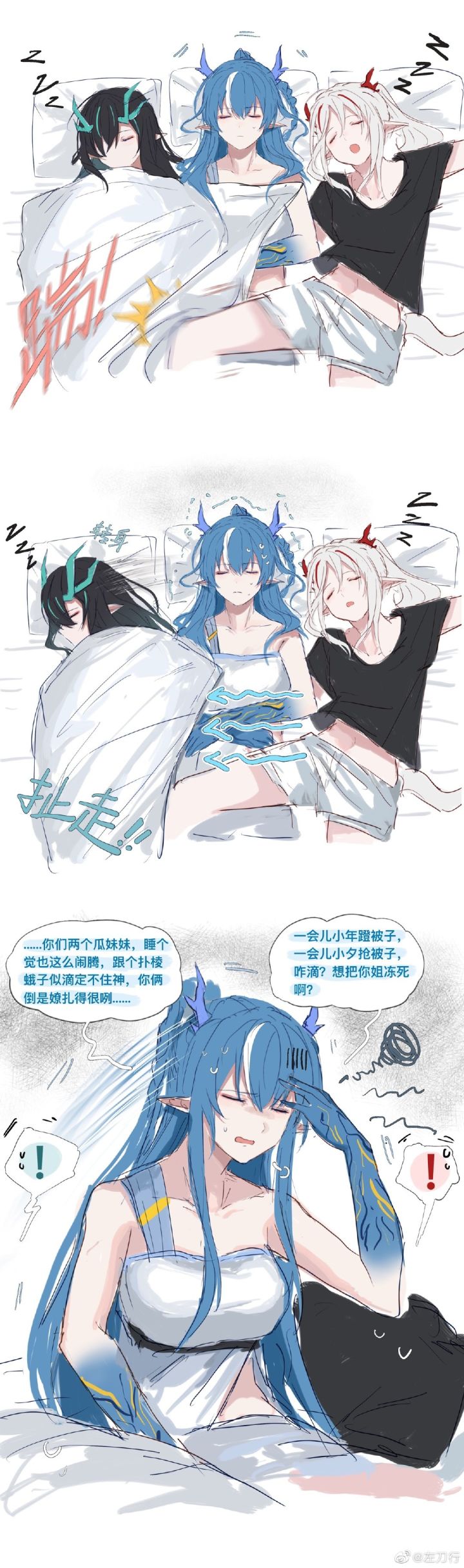 红发萨卡兹一边看着手持终端的游戏画面,一边敲了敲赫伯特卧室的门。“已经九点半啦,你起床了吗,没起我就直接进去了!”喊完这句话,她也没打算等房间里的人回应什么,直接推门进去。如她所料,博士还是一如既往地要等到有人来叫门才会慢吞吞地下地。在此之前,他一般都会穿好衣服,背靠在床头,翻着终端上的每日新闻,回复简单的邮件——就像现在这样。只是今天有一点不同。史尔特尔眯起眼睛,看向他身边异常鼓起的被