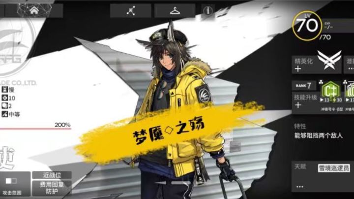 ★★★★★ 特种 机动员词缀:【群攻】【爆发】【支援】特性:技能可使自己选择并移动到技能范围内的地面部署位上,移动后保持移动前血量的同时重置自身的嘲讽等级。属性:【精二满级数据】生命上限:2574再部署:慢攻击:524部署费用:22防御:510阻挡数:2法术抗性:10攻击速度:中等攻击范围:天赋:【火热登场】精零解锁精零:部署战场时对周围四格的所有敌人造成75%