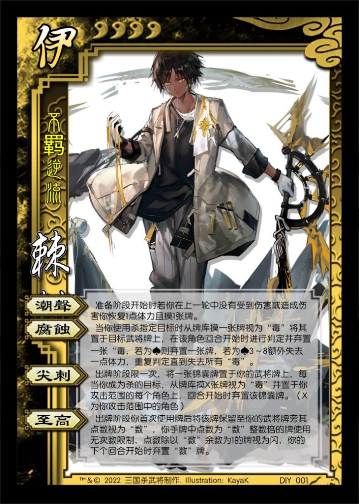 懒了懒了,先整一半……腐蚀是失去体力所以是无伤害来源,与一技能可以配合(应该)至高之术这样设计是因为看了“至高之术”的背景故事:“至高之术的基础是一种圆形的图谱,称为玛丽切斯基圆圈,其中布满了复杂的几何线条,每一 次移动,每一次攻击和防御,均遵循其中计算好的线路来进行,力求在最巧妙的角度以最快的速度击中对方,而不被对方击中。这种剑术不但是勇气和技艺的较量,更是一场比拼智力的数学比赛。”所以才