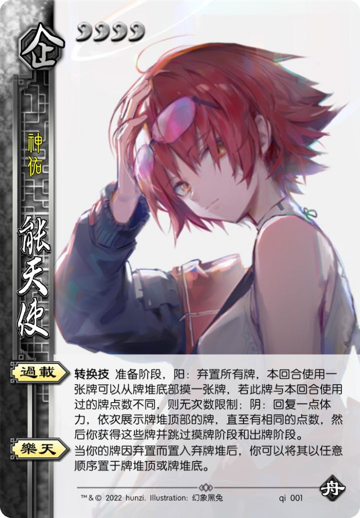 (老图了)(自我评价:契合度、可玩性都考虑了,就是这精简性不行,补丁有点多。)设计思路:(高爆发、乐天派以及一点点神棍属性)过载:核心技能(一回合打不残一个人还配叫过载?),不过考虑到强度修改为转换技以及需要一点点运气因素。乐天:失去了(牌)(心理)依旧能有所补偿。。