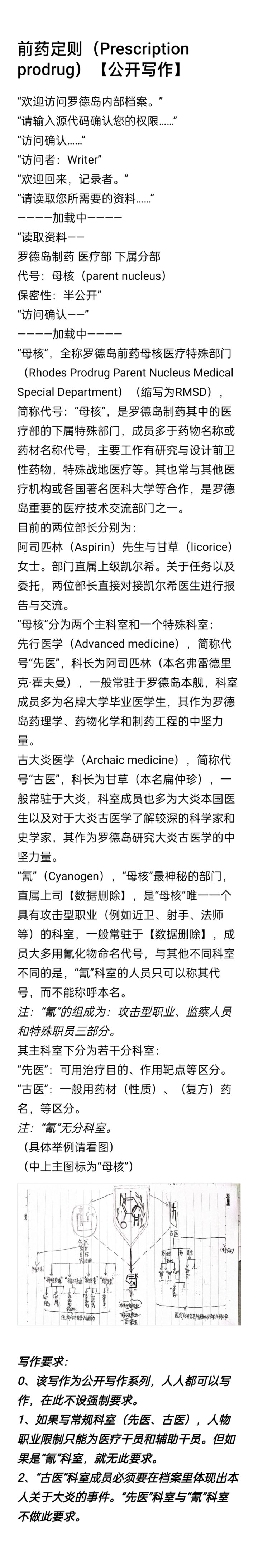 写完直接发帖子,然后链接直接丢进这个帖子下面就好。注:“先医”科室干员都以药物命名,“古医”科室干员都以药物或药材命名,“氰”科室都以氰 化 物命名。