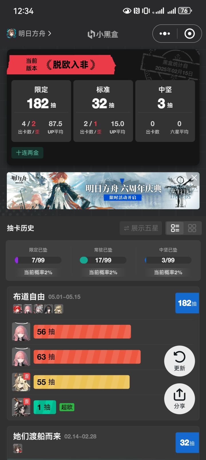 当今天的天空亮起的那一刻开始,6周年卡池就彻底结束了,最后的战绩是182抽黑键,焰尾和两个雷缪安倾尽所有的182抽就出了这些( ・_・)周年庆的卡池爆率真的是一言难尽ಠ︵ಠ这是我过的最痛苦的一个周年庆了阿能,最终你还是拒绝了我