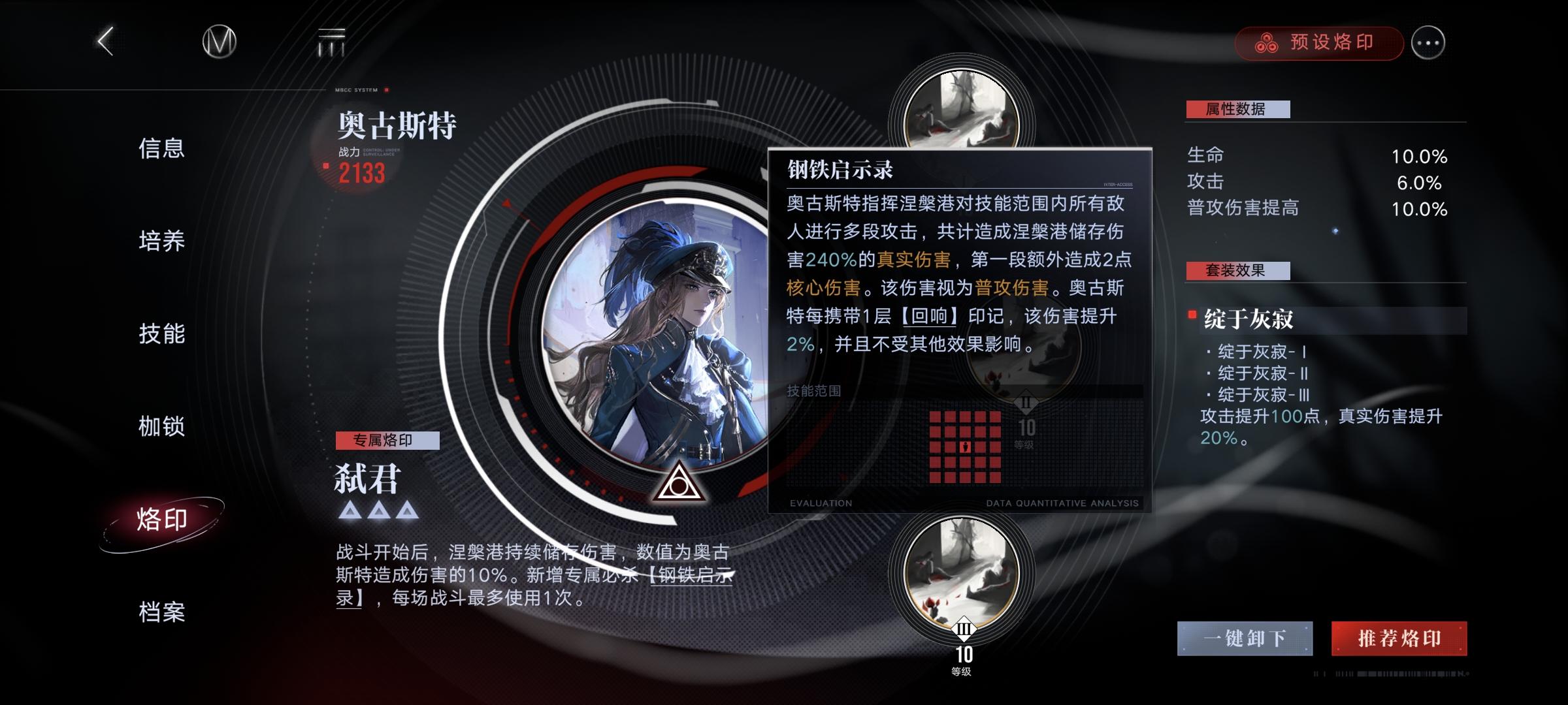 平A是朴实无华的真实伤害无视护甲 60技力两个技能同时携带第一个技能可以随意开关 大招5*5导弹群可以在任意位置释放 一个导弹耗1技力(1潜2点技力释放三个导弹)260%真实伤害 开技能期间不能回技力第二个技能也是5*5可以在场上任意位置释放的轰炸 不过一场游戏只能用一次 240%真实伤害+当前蓝量*2%技能平A吃伤害加成且吃充电宝把她放进明日方舟会怎么样🤓【叠甲本人是明日方舟、无期