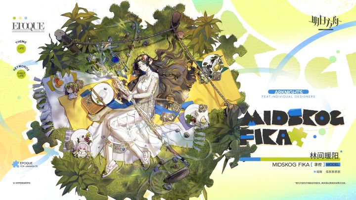 原画的整体色彩很养眼,色彩梯度的引导会很自然的把视线聚焦在侧躺的凛视身上,阳光照射的区域和黄色野餐布与白色披巾搭配也不会让整体色调变得很暗沉,在外围采用拼图元素来加强整体上散漫凌乱的感觉另外还有一些诸如萨米小队的小人偶(在基建动作里小提丰还会眨眼),木制密文板,木制微型传送门之类的小玩意还蛮有意思的并且意外的小人模型和特效个人感觉还不错,只是凛视真的参战率太低了,皮肤本身还是不错的那先这样,