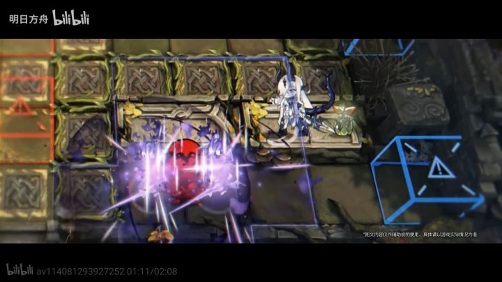 地面上明显的紫色边框疑似攻击范围。演示惯例是3个技能各展示一下,而多个技能不太可能用同一特效,因此最可能是天赋效果。初看范围并不规则,但如果说以每个召唤物为中心向周围4格拓展就非常合理