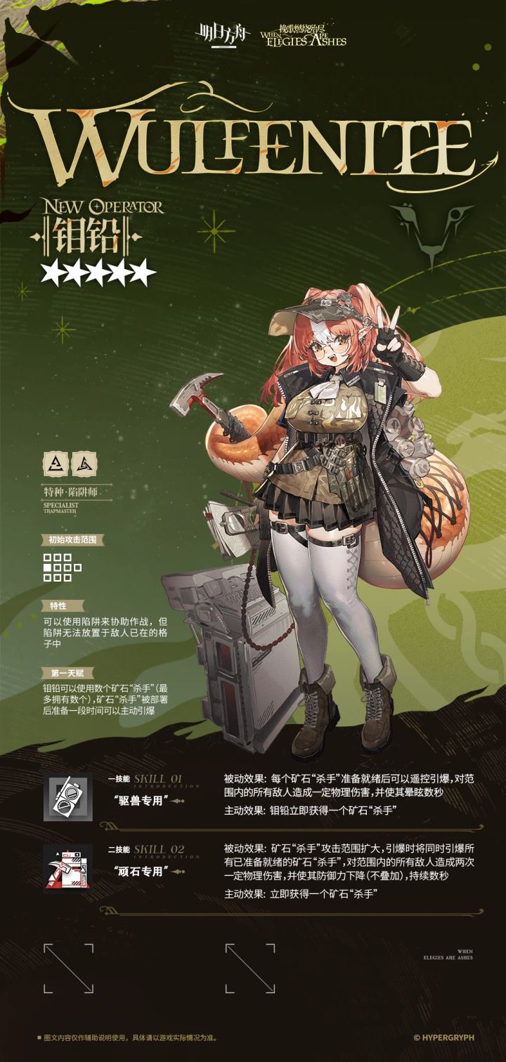 (此处全部删掉,不知道为什么被要求修改,审核敏感度是太高了,一点看不得)精二原画精细度比较低,尤其是尾巴稍这块,变成一坨了天赋更是违背祖训,可以手动引爆陷阱围绕天赋所带来的等待时机的特点,一技能可以在一格范围内眩晕所有敌人,如果CD和控制效果一样的话,那么相较以往霜华和罗宾的单体控制来说要好很多二技能则是为敌人上大范围的破甲debuff,由于是二次伤害,所以自己也能吃到,但不叠加又让这个技