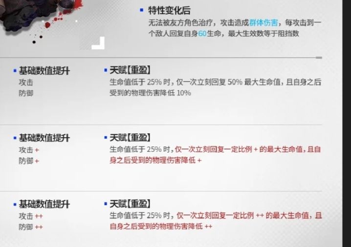 天赋方面,由于所有技能都没有生存方面的提升,所以一二天赋全部都侧重生存,只在一天赋额外附加了一个每秒法伤的效果一技能不必多说,二技能停止攻击是我没想到的,不过打击范围可以一定程度上解决收割者手短的问题,所以暂且先放着三技能则是可以看成是某种特攻技能,可以对相对高血量单位在一定程度上进行伤害的补充,不过需要注意的是应该只有隐德来希可以对心烛造成伤害,但其他干员可以为心烛施加异常状态,如脆弱、物法