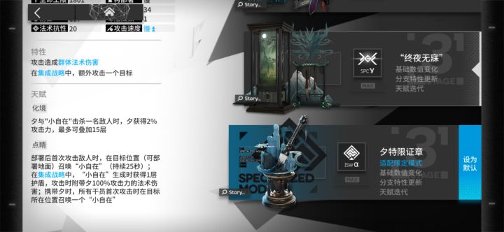 评分:6/10简评:一个只能说是及格但算不上太优秀的模组,只能说在肉鸽里确实提高了夕的强度但并没有做到提高其的抓位,在低难表现还算是差强人意(n9以下),在普通难度(n10以上)则有些不尽人意,首先精二之前堪忧的强度,精二后小自在的生存能力即使有一层护盾也很脆弱,输出也并不是特别出彩,并且部分关卡还会封地板,而且还有自身高昂的部署费用,导致其定位依旧尴尬,而后台让队友召唤的小自在强度在上面已经提
