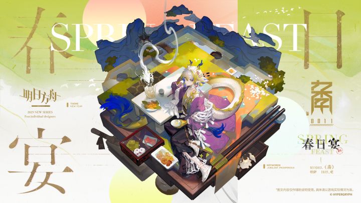 与其说是系列皮肤,倒更像是春天的季节皮肤,这款的故事性很弱,但是春天的气氛感和炎国的传统感很强,从服饰,食物,场景都能看出来前者在人物的身上体现,上有花型发饰,中有披肩(?),下有镂空的鞋和做了剪裁的裤子以及纱质内衬,总体上就会有一种春天太阳温热但风还有些微凉的感觉食物方面则用米为原料的糕点和米酒搭配营造悠闲的气氛感,场景部分也用了山纹流水与游龙飞鹤,以及色彩和花瓣来加强季节感和传统感值得一