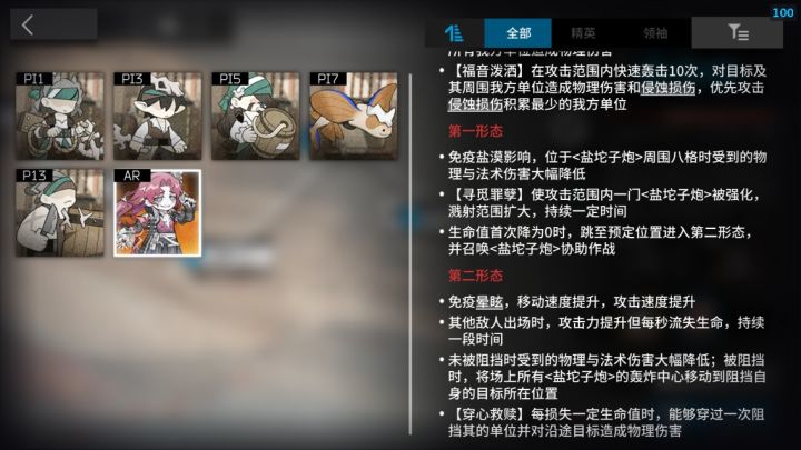 【安纳斯塔西奥,赎罪者】被阻挡是近战,没被阻挡是远程。可以对一大圈的队友造成物理伤害,而且元素爆条之后会降低你防御力,永久降低,越来越低。一形态的时候,要从盐湖最上面走过去,所以他免疫了盐湖(但是二形态不免疫,意味着二形态的时候,只要在盐湖里,必死)=一形态的时候,<盐坨子炮>会保护BOSS,BOSS在他8格附近时候,受伤降低(物理法伤-80%),BOSS可以放技能强化<盐坨子炮>,然后