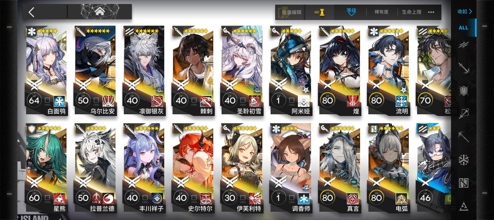 纯萌新差不多百天,打完大部分主线,我这些干员就异格银灰算顶尖的吧,而且只有异格银灰和饼干有联动,即使我借干员打高难,应该不能算目光呆滞了吧。输出位没有全能一点的,异格初雪虽然厉害但还是有缺陷,就是攻击范围好一点就真的无敌了,太容易被远程为针对了。剩下的关借别人的也打不过,就借过别人ew、逻各斯、酒神、新约能天使遥、异格星熊,其他很多干员没用不认识,有没有大佬给好友位。我好友的很多干员都没有,要