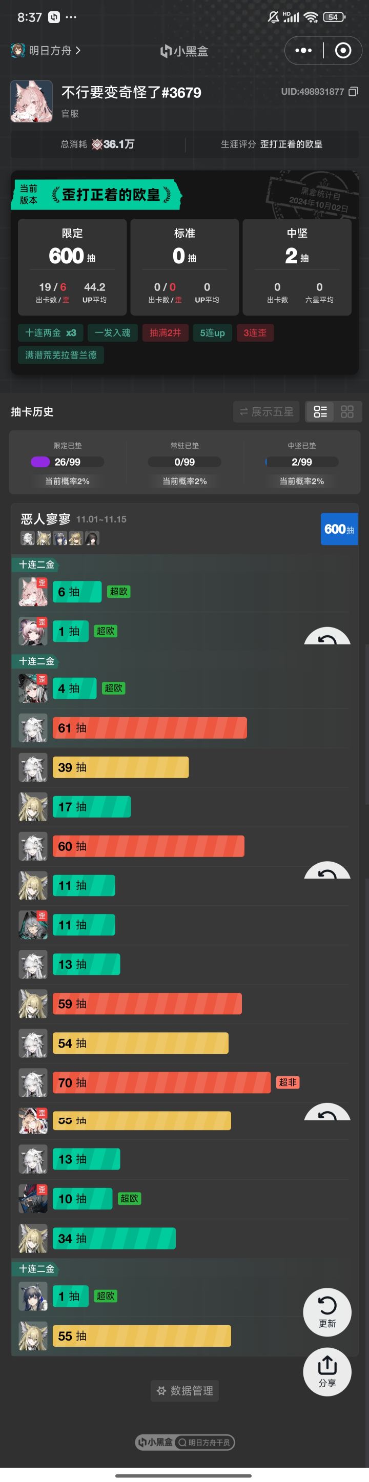 开服第一天抽了200发井了个香香,看了下抽卡记录已经垫了不少,遂决定等抽完后续的免费13抽再补个金出来。谁知今天免费抽完了还没出,又补了七抽出了个中杯牛牛,这个金还花了整整六十一抽!感觉今天的也算是白熬了。