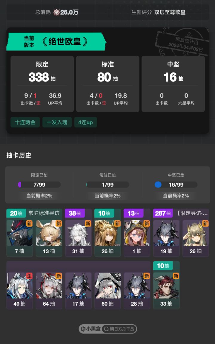 零氪,还有17万玉和50卷没地方用。中间还有个70抽的马鹿没数据