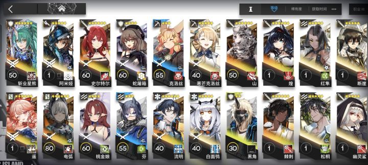 萌新建号五天,跟着博主攻略主线推到了第六章刷完了生息演算🥹还是好缺材料。鬼影肉鸽打到了第四难度刷完了月度奖励,新肉鸽卡难度一了过不去干员练度不够,低星的也没练几个。体力也不够,大佬们咋过的前期抽卡就抽完了新手池,遥和斩业星熊是送的十连出的,后面也没碰过其他卡池话说干员要咋养,一开始我就平均拉,先练了芬和克洛丝后面打肉鸽就想着干脆拉六星,先干到精二六十级再说技能也升到七级没材料专精了。现在就上