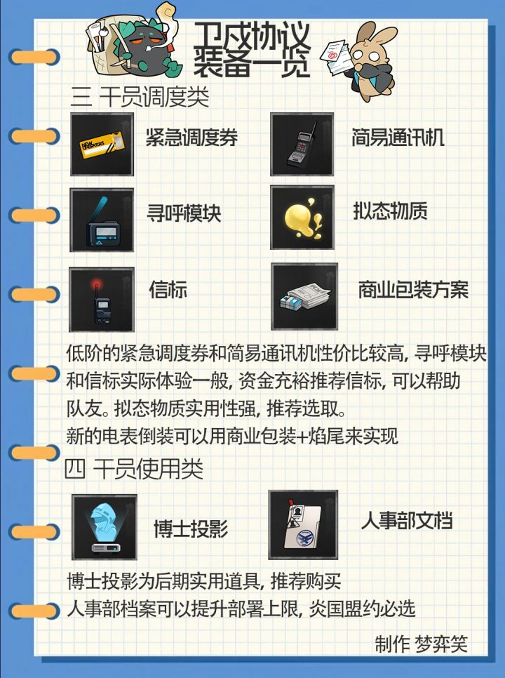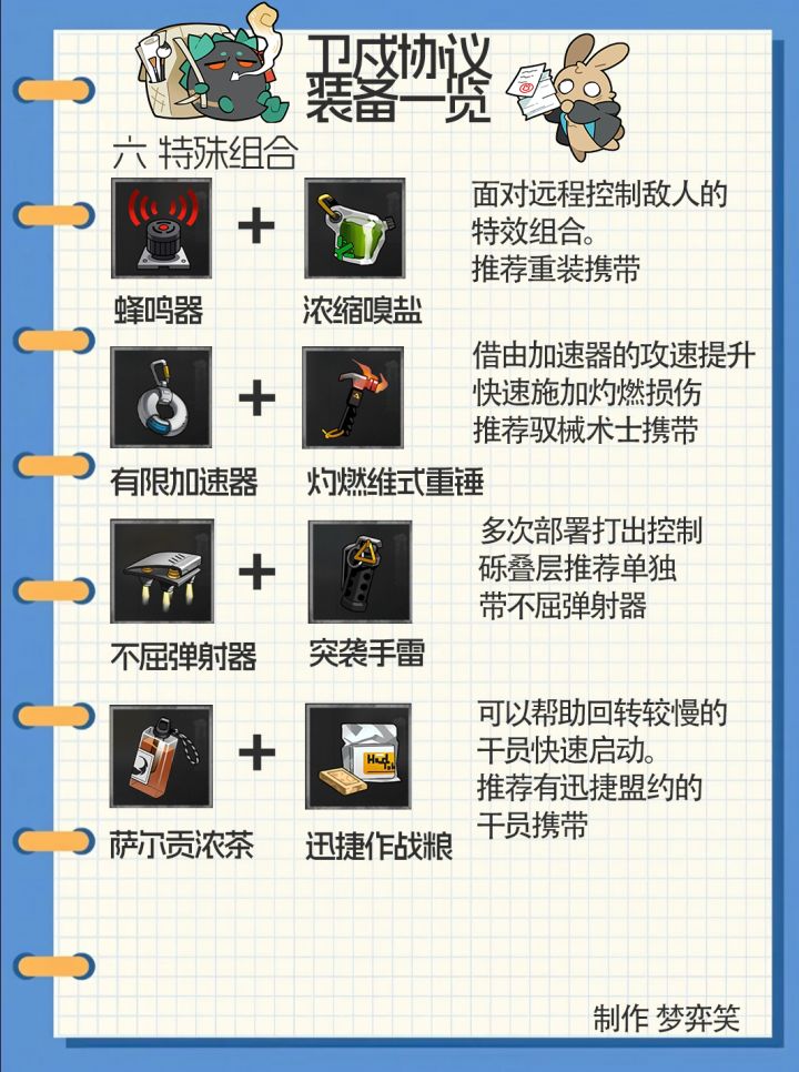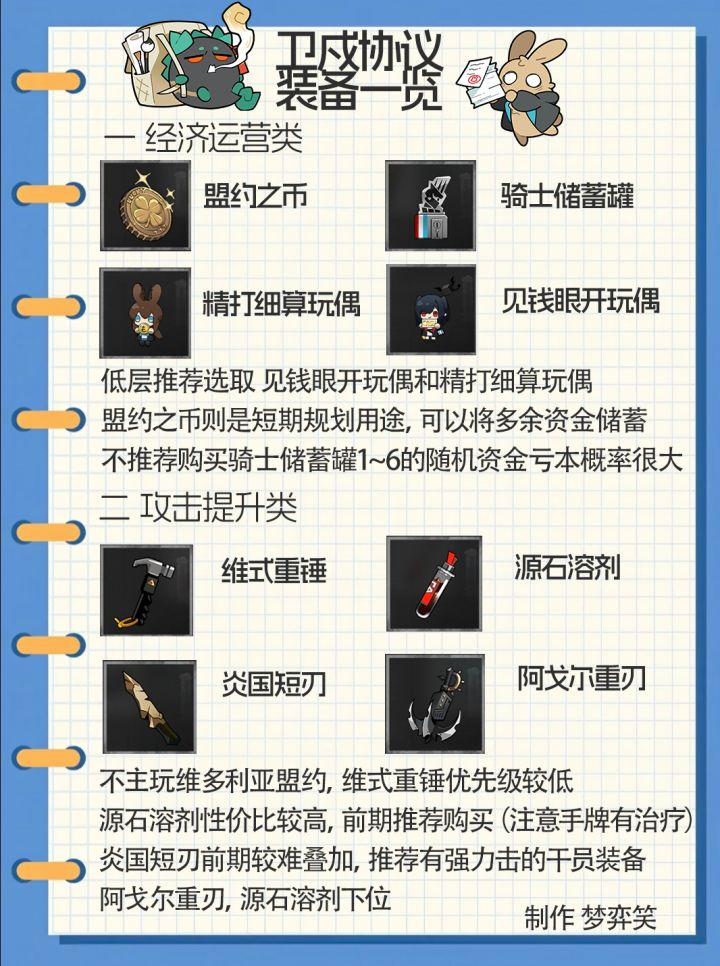 一些日常用到的装备一览。太高级的装备没有写太多,大部分时候不是抽不到就是用不到。感觉源石溶剂的增伤加一资金的价格已经爆掉了大部分增伤道具了。维式重锤数值上一般主要看额外的效果,以及和维多利亚队的配合。其余部分欢迎大家评论区补充交流,这里仅仅只做个人分享。#明日方舟攻略 #明日方舟十字路口 #明日方舟卫戍协议
