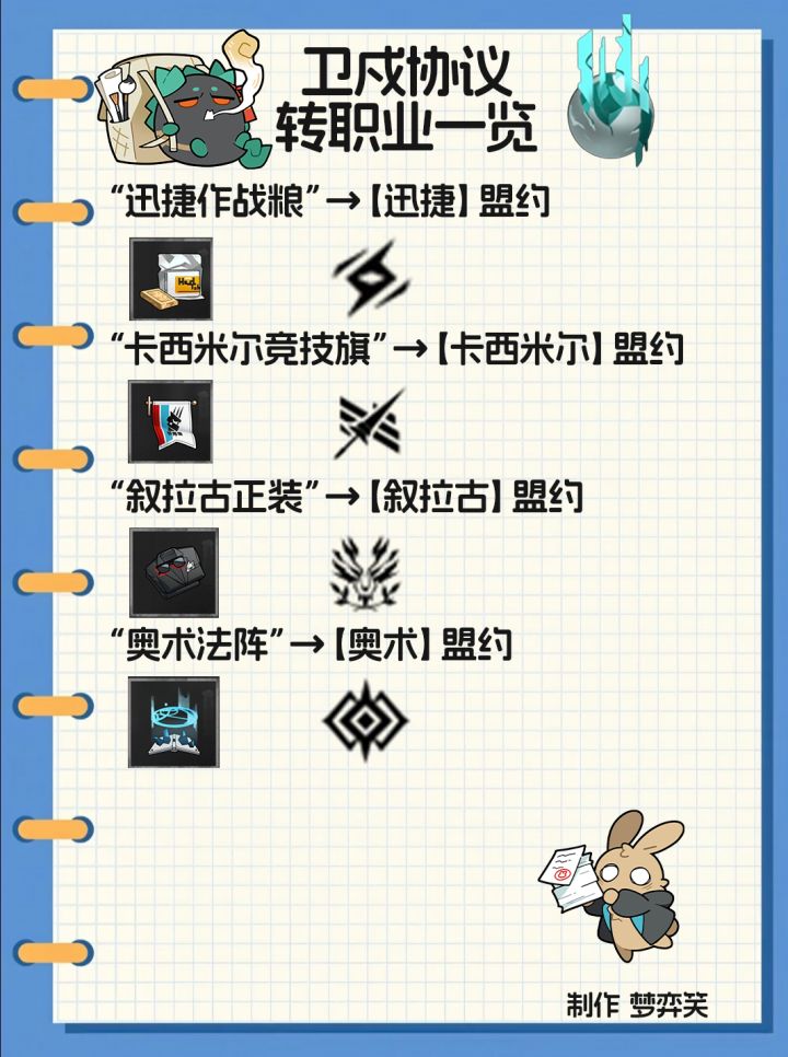 前几天有博士评论区问过的,这边做个表希望能够帮助到大家。之后会更新一些详细的打法,也欢迎大家评论区交流思路,方便更好的进行游戏。个人感觉小盟约的转职业总体没什么用处,毕竟拟态物质是一个高级道具,后期不一定对小盟约有用。另外给缪尔赛斯转职是可以凑炎国九羁绊的,有些人说不可以,这里辟谣一下。#明日方舟十字路口 #明日方舟卫戍协议 #明日方舟攻略