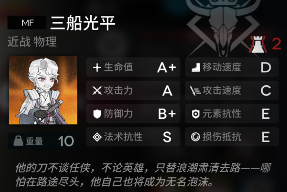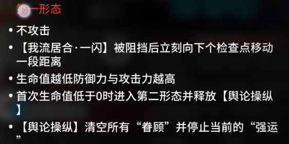相信很多博士都是出来之后才看的简介,那简单为没打的博士介绍一下。被动:血越低防御力攻击力越高①阶段一不会攻击,如果你阻挡,会往下个检查点移动。(所以,不要阻挡,上法伤干员。)首次生命值低于0时进入第二形态并释放【舆论操纵】(清空所有“眷顾”并停止当前的“强运,就是上面进度条清零,没buff了)②阶段二被阻挡后立刻向下个检查点移动一段距离,被阻挡的单位被击倒或撤退后立刻回复所有技力。
