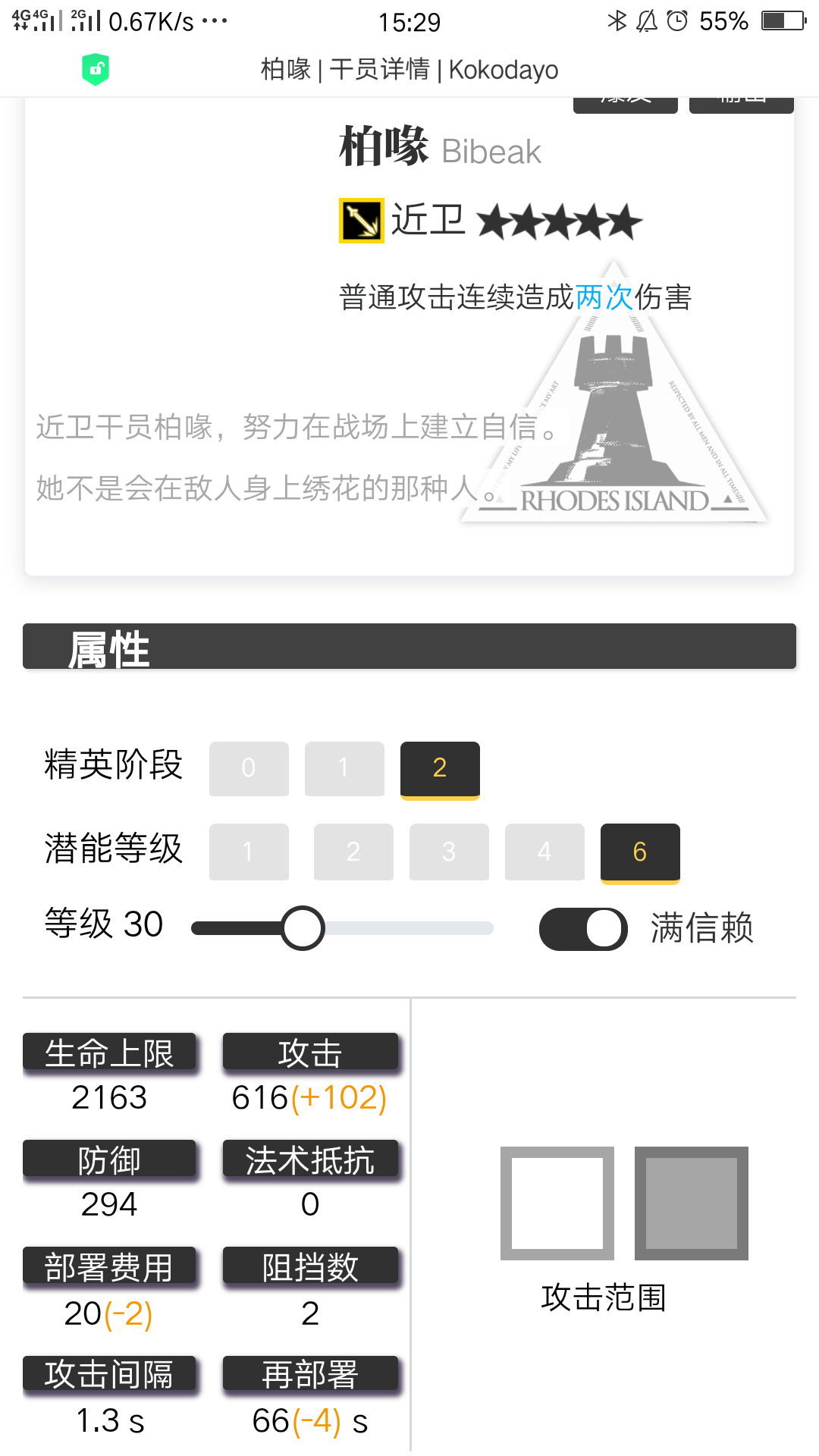 这里显示精二三十级满信赖时,面板攻击破600(因为是活动赠送干员,直接计算满潜)而且配合满天赋,攻速可以压进1秒之内。优势:1.和陈sir一样是双击么么哒型的近卫,清杂兵速度很快。2.手动触发超短CD的范围控制,而且还能充能三次,控制掌握的好,三层CD让敌方起码5秒钟不能动弹。3.立绘精美。4.活动干员,参与活动不仅仅可以获得,而且还能轻易满潜,基本上人手一只了。?:1技能说明,对