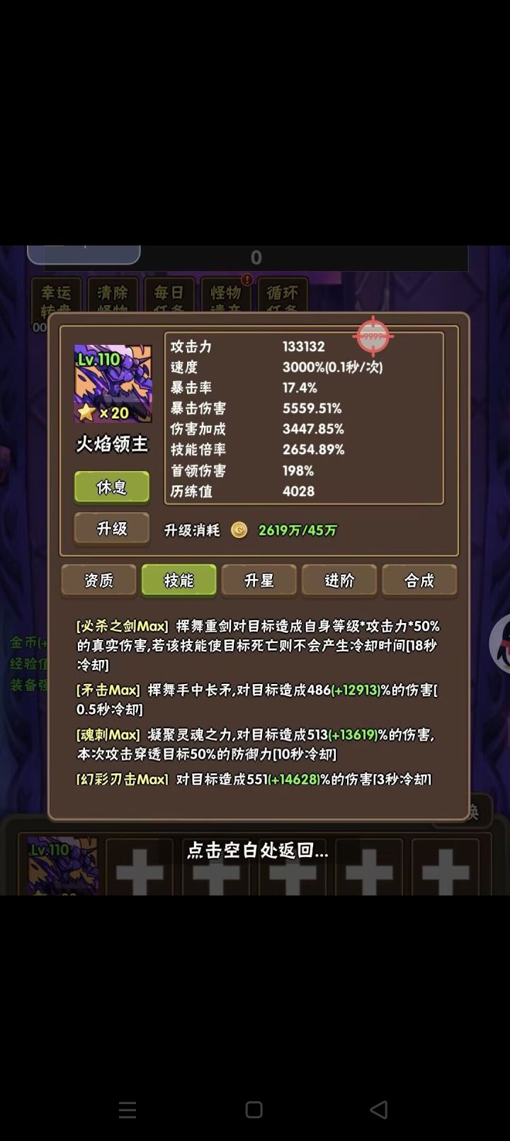 新手刚玩的时候,看完广告,再看一下广告卷和钻石的换取比例,再加上初期推图的速度,就发现钻石根本用不完,但是到了后面幻化级别高了,一小时几十上百次的转生效率下,高级推图需要100钻,更不用说合宝石,装备升星。所以合理的运用钻石。还有就是本职业技能不要去用技能碎片换,用怪物遗迹批量换取,攒下的技能碎片换90一次的通用技能。最后小偷是后期推图转生的利器,多存一些遗迹令牌,越早开启满技能小偷,效率越快
