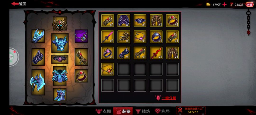 装备篇魔窟:1星:癫狂改、影流改。2星:胧月改、破势改、残心改。3星,随缘(荆棘改,荆棘)。4星,冰羽腰带、冰羽鞋。5星,真龙腰带、真龙裤子。配装推荐:顺序为:武器,头盔,腰带,甲,鞋子,护腿。一星:癫狂改(癫狂、缠火法典、魔王怒够或魈和萧玉用噬魔剑)、噬魔头(缠火头)、噬魔腰带(缠火腰带)、噬魔甲(无噬魔或魈和萧玉用缠火披风)、噬魔鞋(缠火鞋)、噬魔腿(缠火腿)。二星:胧月改(
