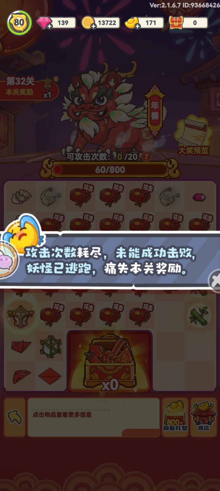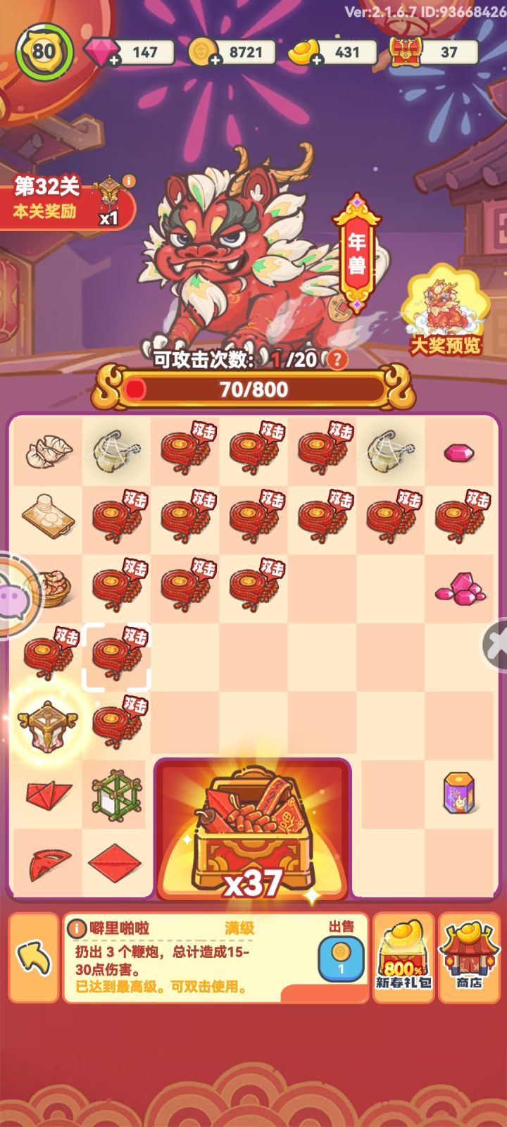 作吧,这次活动完事就退游,攒了10几个烟花吧,还是打不过,基本都是最低值,这个大年兽应该是默认全程拿烟花打,剩70点我又攒了个烟花,但只打了10点就结束了,相当于没有而且这个活动有用的是打年兽的掉落物,但如果棋盘上没空位,掉落物会被吞掉,难道要我扔掉一些鞭炮吗,一个小破游戏,过年还给我添堵,刚开始没研究明白,想着咋的也是过年活动,真是白花30块