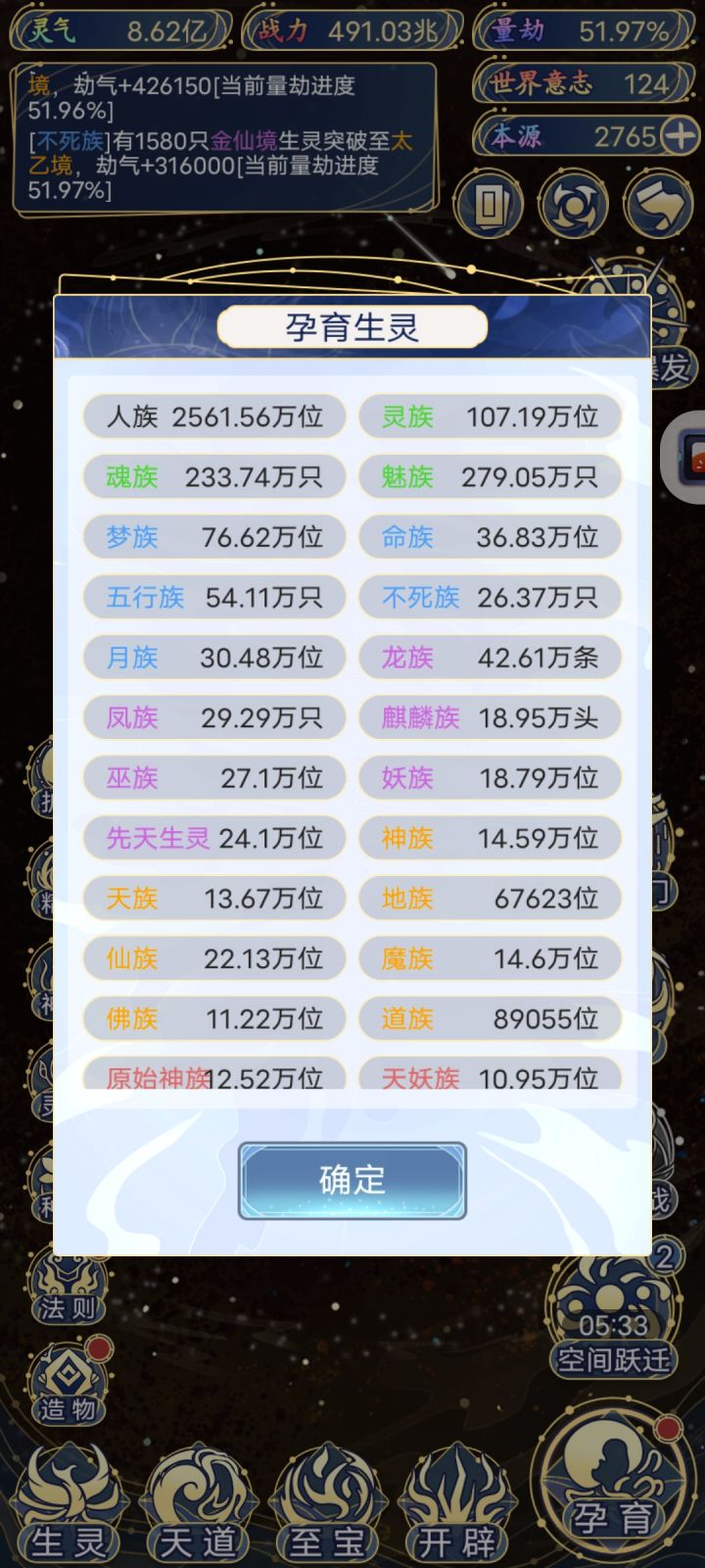 两个建议一主界面可以自由放大缩小,最好是两指快捷放大缩小,不让每次跃迁后都要上下来回找各种资源,一不小心就漏资源了。二孕育生灵选项提示一下当前种族数量和种族数量上限。