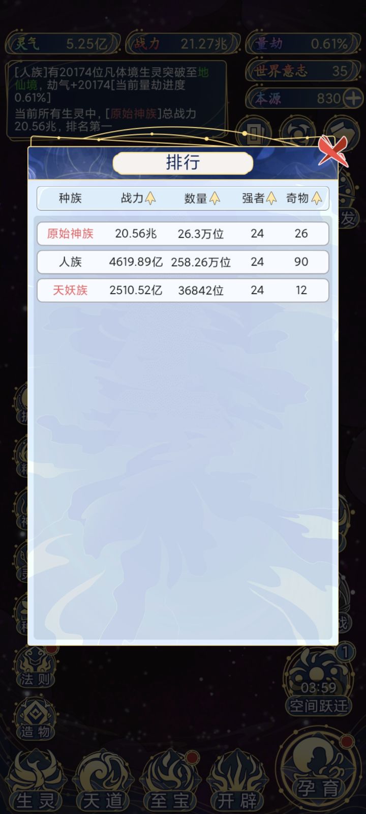 这个游戏玩了两天,前面感觉还是很好玩的,会想起凡人修仙传的情景。玩多了后面就有点无聊,因为操作很单一,就手指点点点,然后等时间,再点点点。建议游戏加一点随机性的东西,并且调整一下平衡性。越到后面种族越厉害,前面的就没啥用,我就很想一直用人族,到后面发现数量堆不出质量。。。#反馈