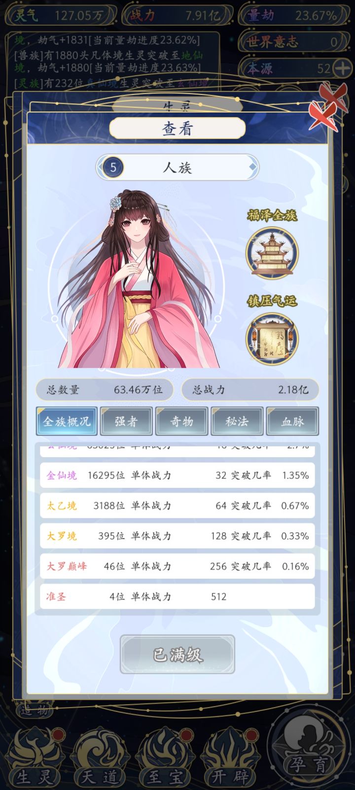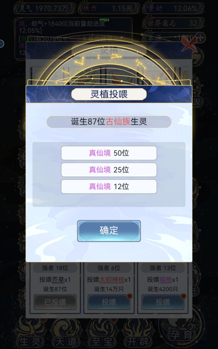 人口不能自然繁衍玩的有点尴尬,只能靠孕育和灵植和神战。我觉得自然繁衍合理一点,可以顺带加个时间线自然死亡也可以,人口没有变化玩着很怪。