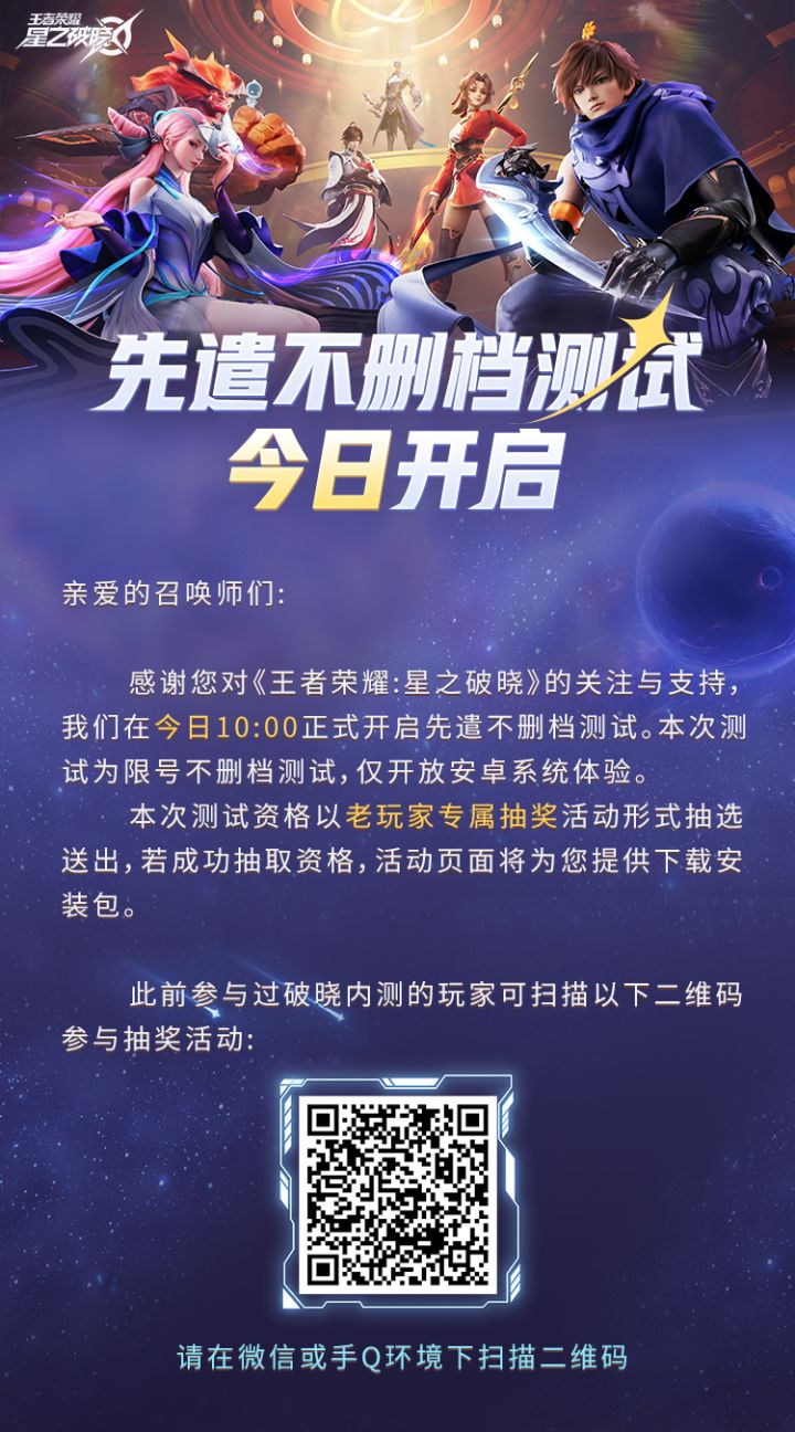 亲爱的召唤师,王者荣耀《星之破晓》集结终测即将开始!英雄集结,破晓将至!晓老弟的邀请函已送达——终测招募活动来啦!活动时间:2月22日14:00-3月3日24:00参与方式:进入【星之破晓】游戏专区,填写测试招募问卷即可参与报名,获得资格的用户后续将收到平台通知,敬请关注。若您参与过往期测试,则对应账号将默认拥有本次测试体验资格。*温馨提示:本次测试仅限安卓用户,iOS或者其他系统的召唤