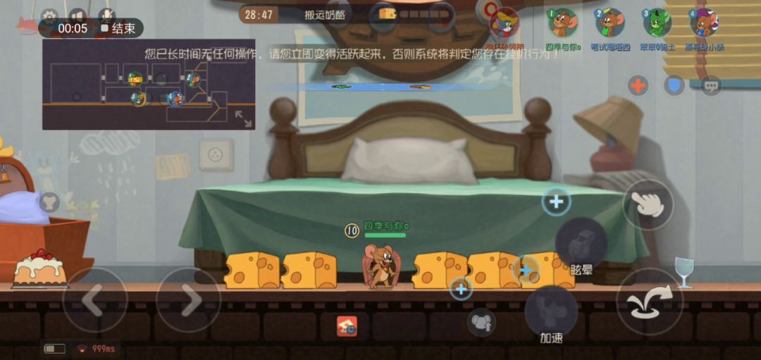 点下退出战斗的时候,将会-20分钟游戏时间,众所周知,时间到了自动判定猫胜,所以会导致猫胜利正常游戏时间是1分钟·侦查期+10分钟·奶酪期+4分钟·墙缝期=15分钟·整局时间至于其他的,emm,其他模式你用不了人机,所以......但是游戏时间>20分钟将会出现问题,-20分钟后还是没减完,游戏还是可以正常游玩但是,游戏计时器停止了,退出战斗也不会再减少时间了,你只能被迫推完奶酪然后砸墙(