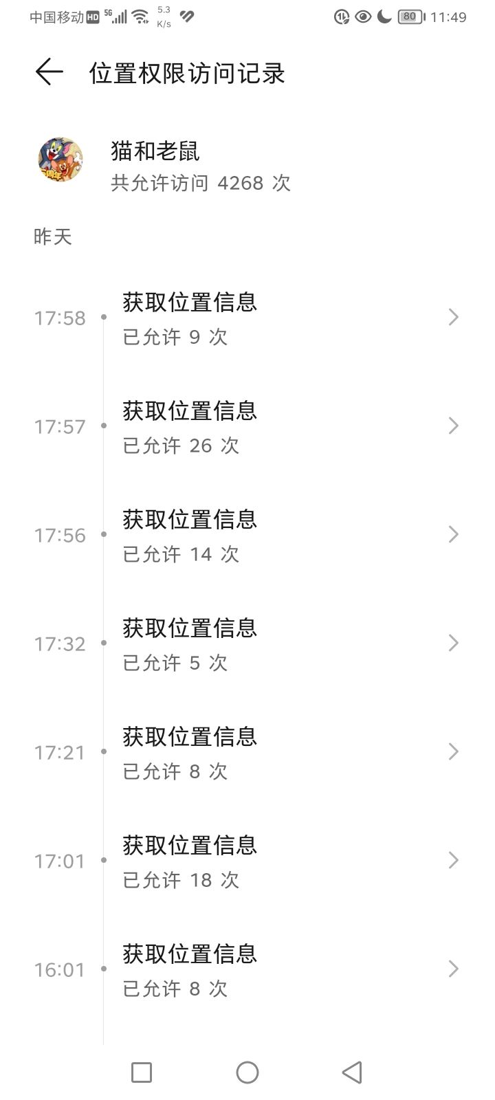 好家伙,猫鼠官方是要顺着我家网线来干嘛?访问四千多次位置信息……太离谱了,几乎是每分钟都要访问,我开导航都不需要访问这么多位置信息吧……最主要的是,我看了下,猫鼠最多一分钟访了61次,这真是离谱他妈给离谱开门离谱到家了……