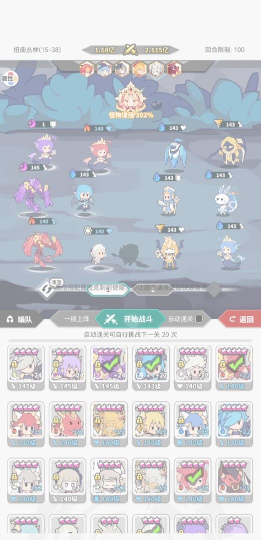 先发张关卡图,免的有人说我乱教别人。这个游戏,主要分为几个大部分的内容,推图爬塔,圣域,魔物入侵,PVP先说大家熟知的推图和爬塔。普通的推图和爬塔,需要的阵容比较类似,现在主流就2套,兔子流和镰刀,为什么说只有这二套呢,我来回来去也试了很多阵容,什么风龙拉风鸡,什么多控制,甚至光独眼阵容。基本都是扯淡。这个游戏因为你想要极限推图,有怪物增强机制在。你没有无视防御基本打不动怪。当然佛系玩家除外
