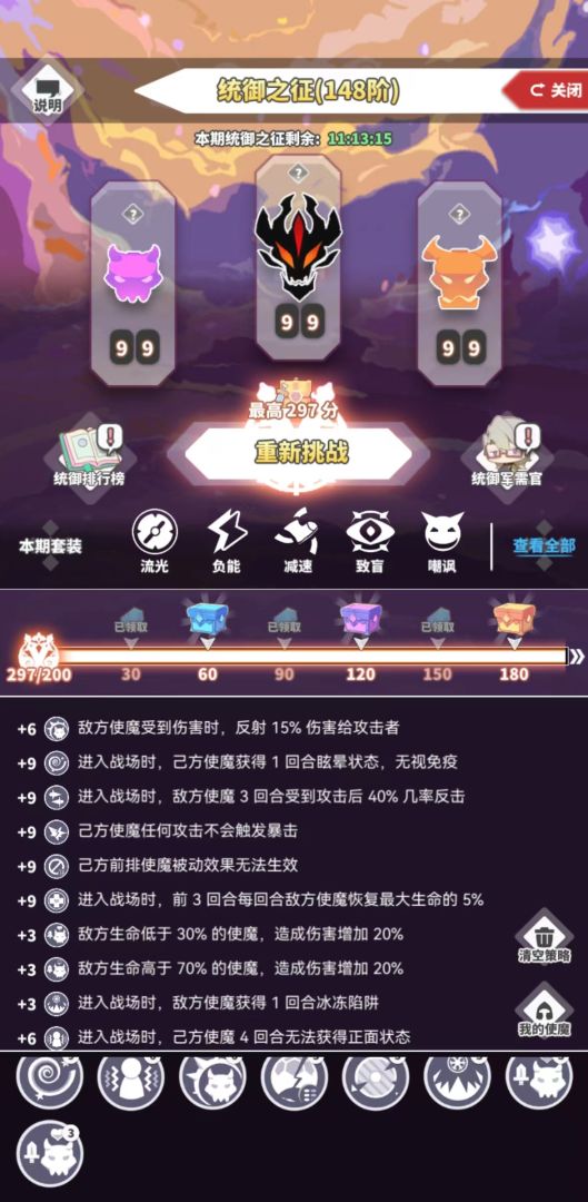今天封全部被动,还有反伤。 试了几种阵容,最后选择兔子队才打满了297。#2022 TapTap 年度游戏大赏#攻略#使魔计划#使魔计划统御#游戏推荐#游戏讨论