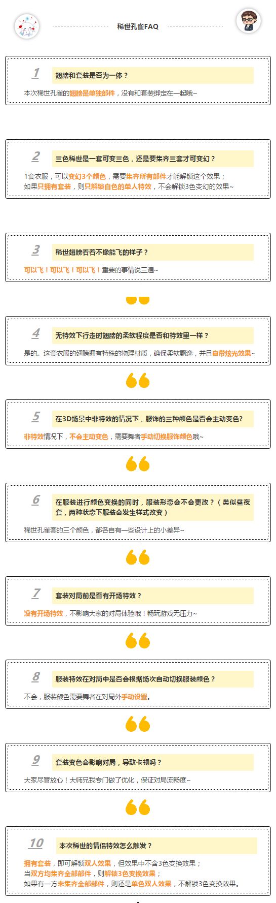 “稀世孔雀的翅膀能飞吗?”“衣服和翅膀是一体的吗?”“衣服特效会自己切换吗?”哎呀,小主人们别着急!机智的本6已经把大家伙的疑问都拿小本本记下啦~还邀请了大师兄在线答疑!关于全新稀世孔雀,你想知道的都在这里~(*^▽^*)小主人们想要知道的答案师兄都一一解答粗来噜!为师兄点个赞~当然!如果小主人还有什么疑问,可以【写留言】告诉66哦,66会再去“拷问”师兄哒~