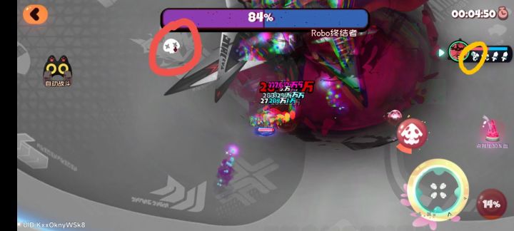 弹力果冻里的“中毒”效果(如斑鸠、艾尔良、魔菇),都会在boss的状态栏增加一个“骷髅头”的标志(见p2红圈),新武器魔菇专武可以造成中毒效果(见p1),但是不会附加这个标志;同时,魔菇的被动可以在场上敌人中毒时增加伤害(见p2黄圈),这个效果魔菇自己的主动技能、斑鸠和艾尔良技能造成的中毒都可以正常触发,但是专武并不会触发(见p3,只使用专武攻击时,没有中毒标志,魔菇也没有获得被动层数)。经过练