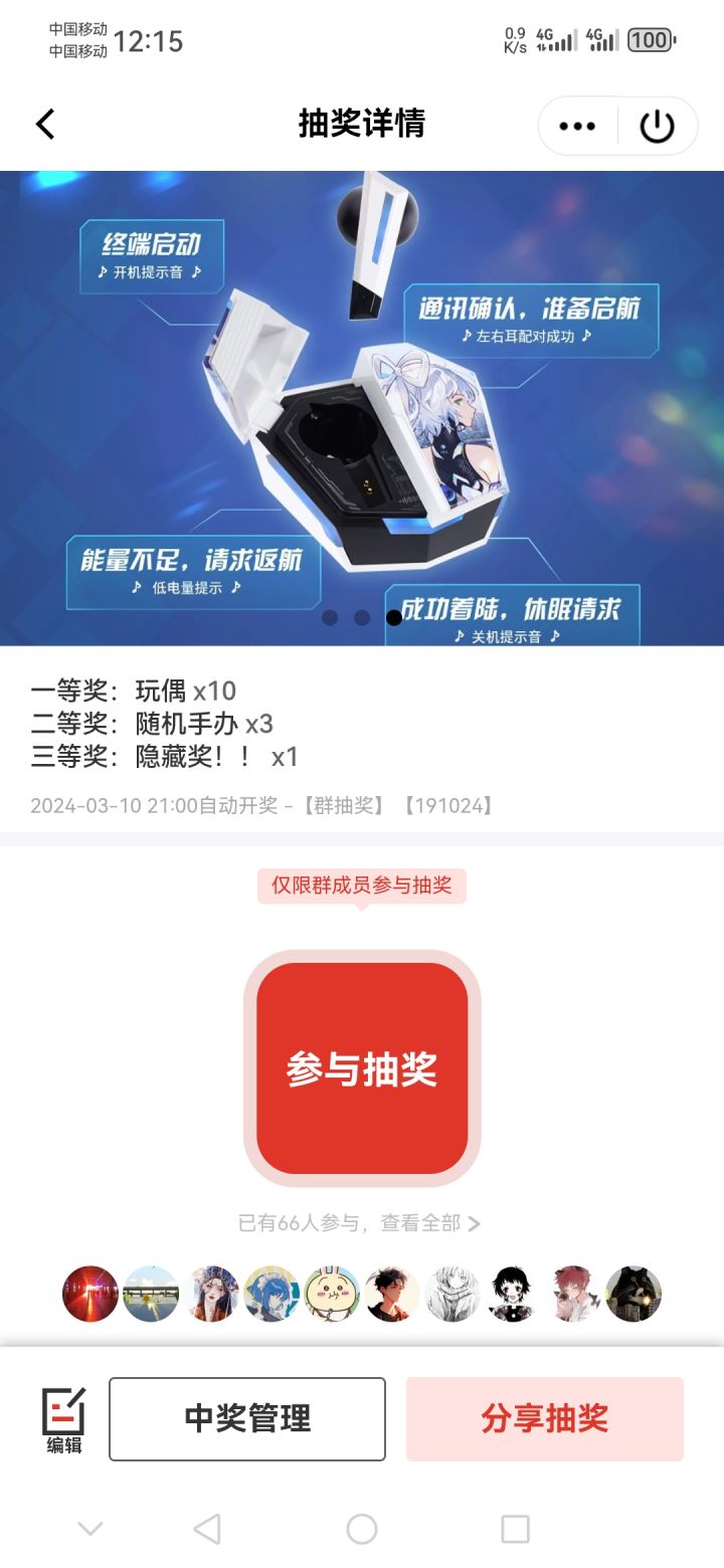参与抽奖需知!!!(免费领取详见下其他公告)1.抽奖方式!(划重点)群抽奖助手参与!群抽奖助手参与!!群抽奖助手参与!!!2.抽奖奖池:洛天依玩偶×10(详见群相册)随机vsinger手办×3隐藏款-vsinger耳机×1(暂定)ps:参与人数满100,则新增隐藏奖数!满100后,每新增50人则手办+1!!后续进行二次抽奖!3.活动时间:3月8号-3-10号可参与,1