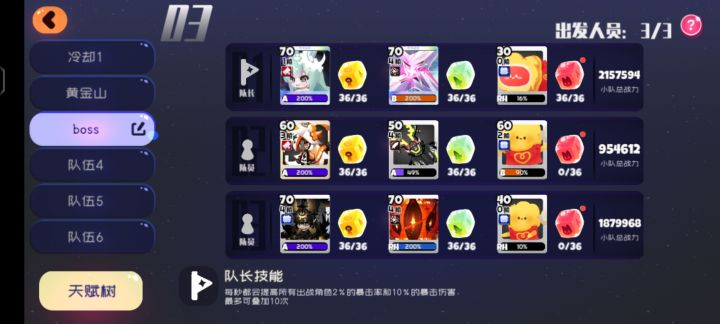 阵容: 队长橘九,武器任意,灯泡泡 橘九(cd加到30%,其余放生命) 武器(任意) 宠物(生命) 朵朵,武器任意,达拉崩吧 朵朵(四行cd,两行移速) 武器(任意) 宠物(生命拉满) 任意强控(推荐黑绒),武器任意,打尻煤球 角色(cd拉满) 武器(任意) 煤球(生命拉满) 思路: 进图开局操控朵朵(移速快可以拖着队友走) 橘九远处放树拉怪,朵朵趁机给水母回血。 助战选个硬控,如果阵容没黑绒就借个cd黑绒。 可以控一下怪的数量,剩几只就别打了。怪越少越好守。 朵朵和第三个队伍很脆,开局可能会被秒,没关系多试几次。 助战黑绒开局放技能会全屏控制4秒,趁机找好位置,放下橘子树后赶紧走开。