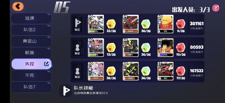 分享一下我的失控秒过无复活的阵容队长 白绒绒 红峰 脆脆块 妖炽 剪刀 粉狐 黑星宠物我只带了一只脆脆块就过了 有条件的可以搞三只(60 50 40级各一只 不要一股脑全6啦) 妖炽和白绒绒的方糖不用开 随便把空填满就行 过的关键是粉狐 全加技能糖加满就行 2 3阶为主 武器血型最好是B 全带爆伤 给大家提供个参考😉