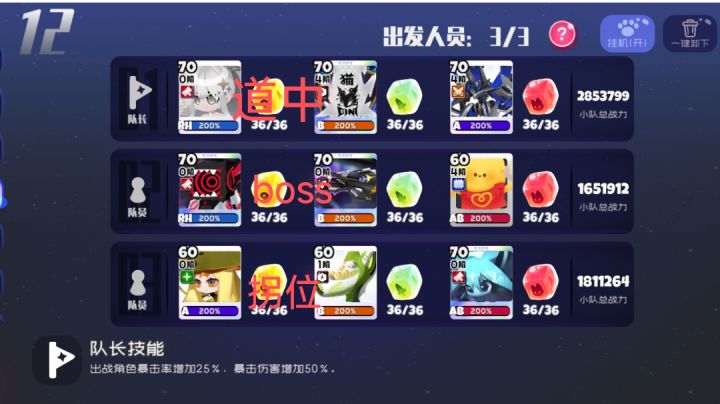*此文以为了减少大家在12之间浪费的时间而写,仅供参考,如您不认同我的理解请以您自己的理解为主。首先我们来看个视频:如果你想跟我一样节省12之间的时间的话,别扛,听我说。这里我们把队伍分为三个位置:拐,道中位,boss位。拐就是主要负责给队友加buff与回复的角色;道中指负责在遇到boss前清理小怪的位置,在果冻里这个位置要有对群能力和斩杀线;boss位顾名思义就是专门打boss位置,需要非