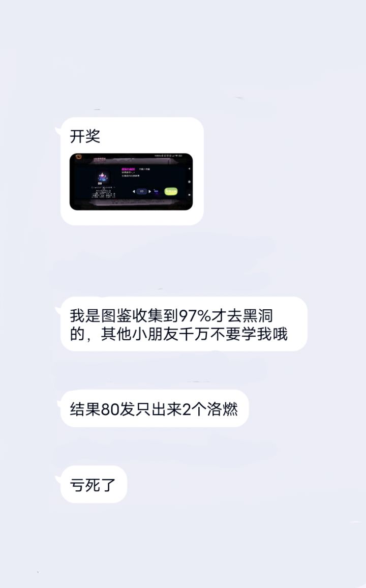 没有前言,直接来吧Q:为什么不要碰黑洞A:黑洞爆率不高,且需要分解人物武器宠物,容易把某些其实特别需要的人物武器分掉,看黑洞盒子出货图就上头的孩子们,好好想想,你不出货还会发吗,没人会记住那一个超罕背后是几千崽的投入。ps一群是禁止发黑洞盒子的,原因前面也提到了,容易误导萌新,发盒子的别让我逮到了,逮到直接把你扫清Q:为什么不建议买初始号A:首先不是不建议,而是禁止,账号交易本就不是一