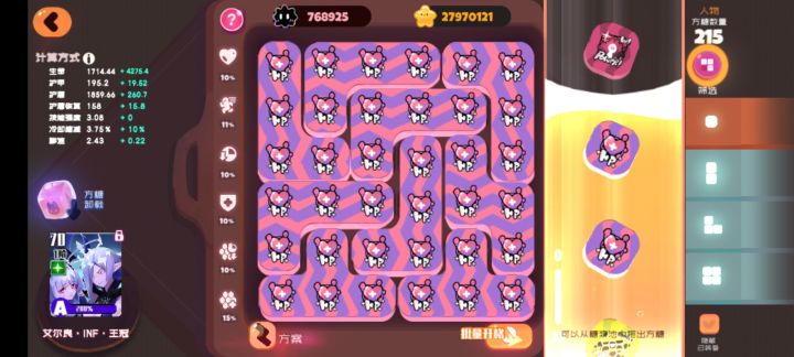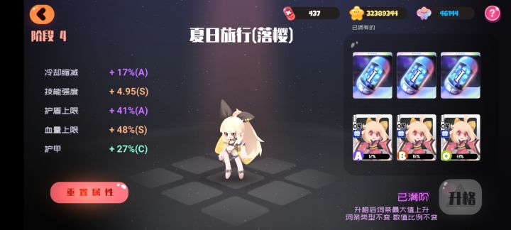 这期因为属性和护盾的原因。不像上次一样只带脆脆块。这次带了0阶蛋仔和打call。结果打call屁用没有。打BOSS失误直接被秒了根本撑不住。蛋仔是用来快速破减伤盾的。武器方面。攻击频率太慢。但是伤害非常暴躁。4阶面板能有55%基础暴击率。破甲也非常高。缺点是攻击和爆伤没有折火高。角色方面。4阶小樱带9CD糖可堆到80%冷却,带9技强可堆到52技强。总结 纯纯的数值怪。武器伤害高 技能伤害也高