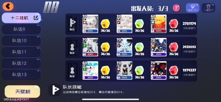 分享一下我的十二之间挂机阵容,真·挂机,无论词条有没有泡泡盾,无论有几只汽水猫,第十二层也随便打全员带冷却,武器全带爆伤,巨灵标配一个超阶方糖,鸡块全生命,爆伤宠物随意但是有一个硬性前提,菜园必须养的特别好,护盾和护甲得拉满,还有十二之间的天赋必须拉满,不然挂机遇到汽水猫容易翻车#弹力果冻 #十二之间